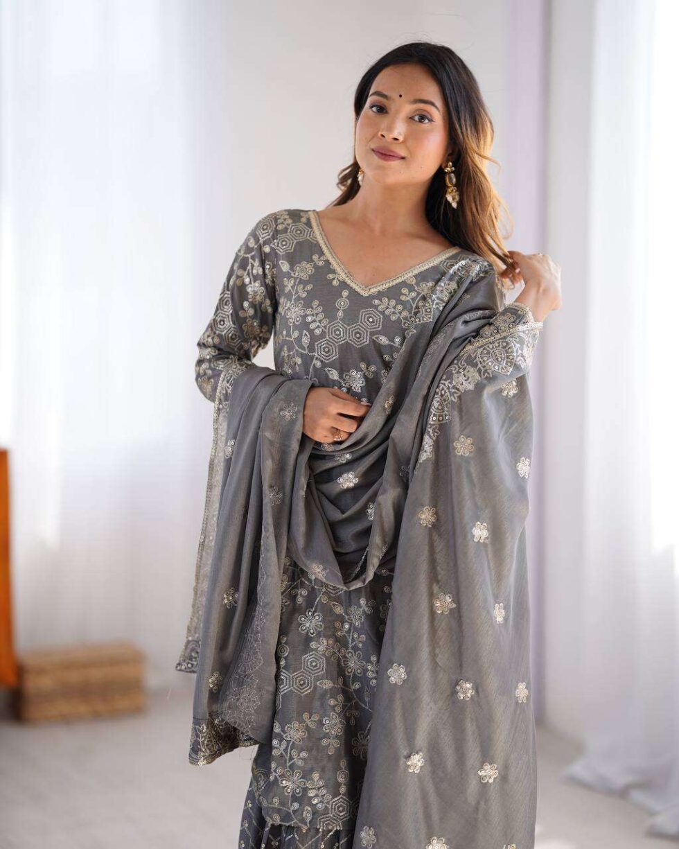 Women’s Chinon Silk Embroidery Sequence Work Straight Kurti With Sharara Suit and Dupatta Set 🇮🇳 ₹4,499.00